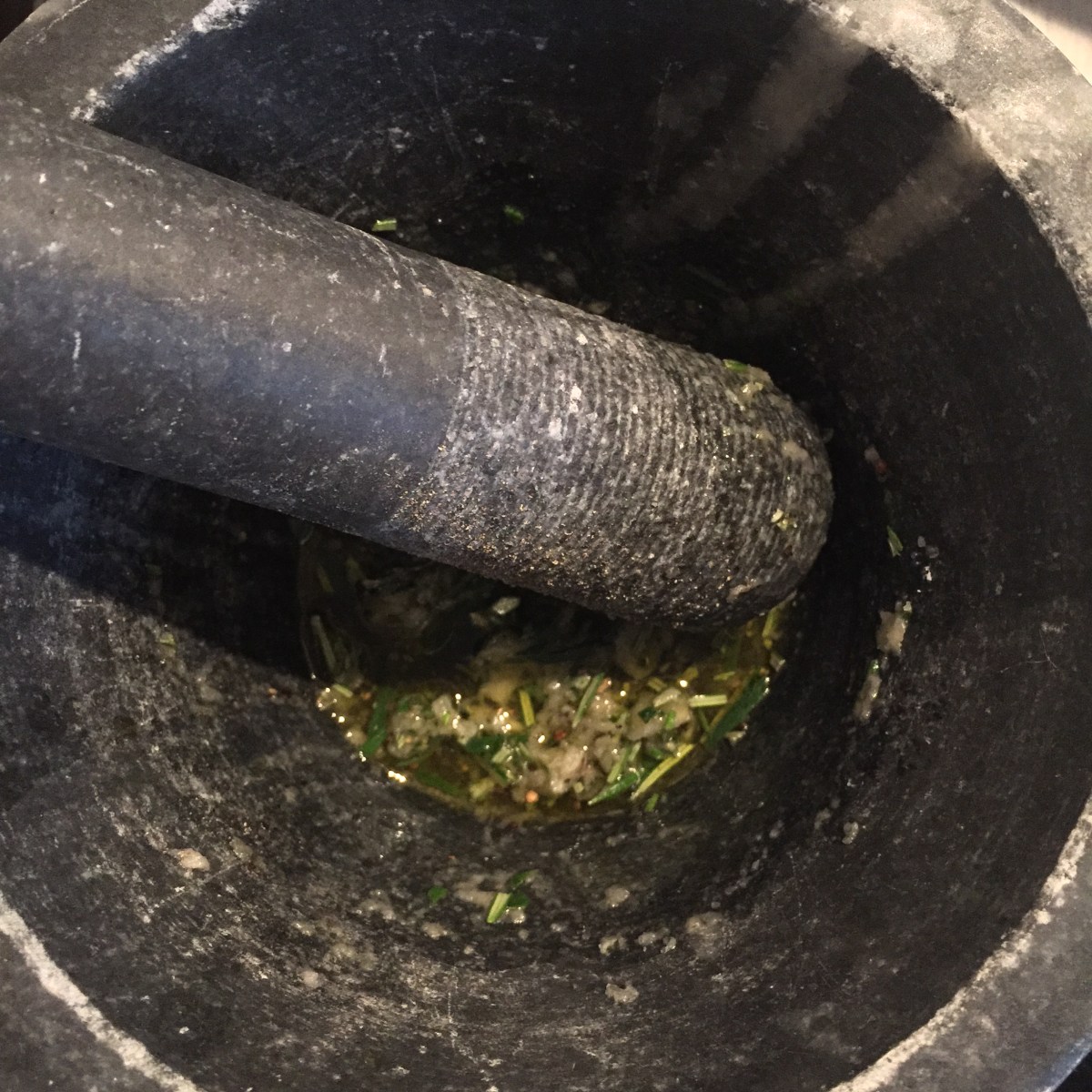 Pound garlic with salt and add chopped rosemary, olive oil and pepper to make a rough paste